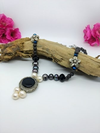 Diese Trachten Kette ist aus Holzperlen und echten Süßwasserperlen in weiß und schimmernd grau kreiert. Das Cabochon hat dunkel blaue bis fast schwarze Farbe.